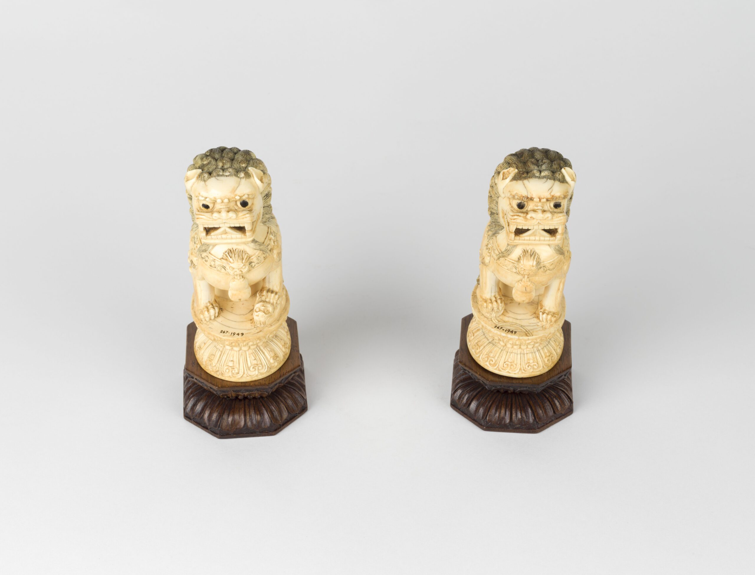 Pair of ivory guardian lions / lions of Fo / lion dogs (shi shi) on wooden lotus bases used to protect from evil spirits. The curly hair on the lions usually depicts a high rank in society.