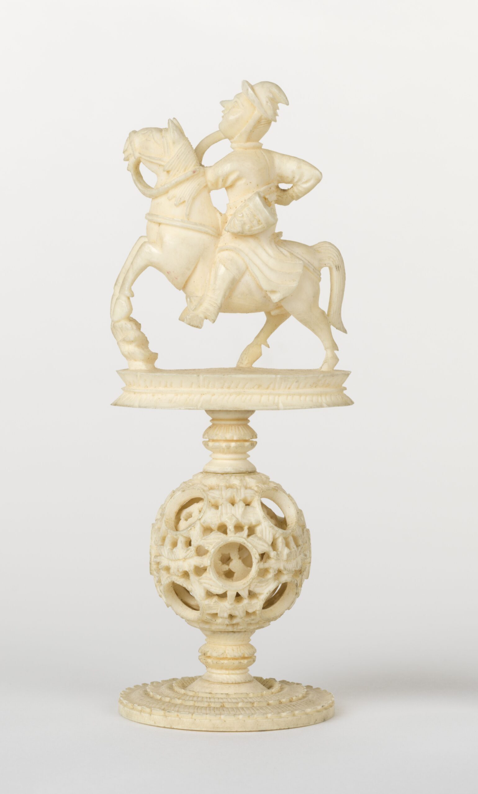 The chess pieces feature an intricately carved bowman / archer on horseback supported on flat circular lotus carved base with globular puzzle ball stem in ivory. The costume on the bowman may be Mongolian.