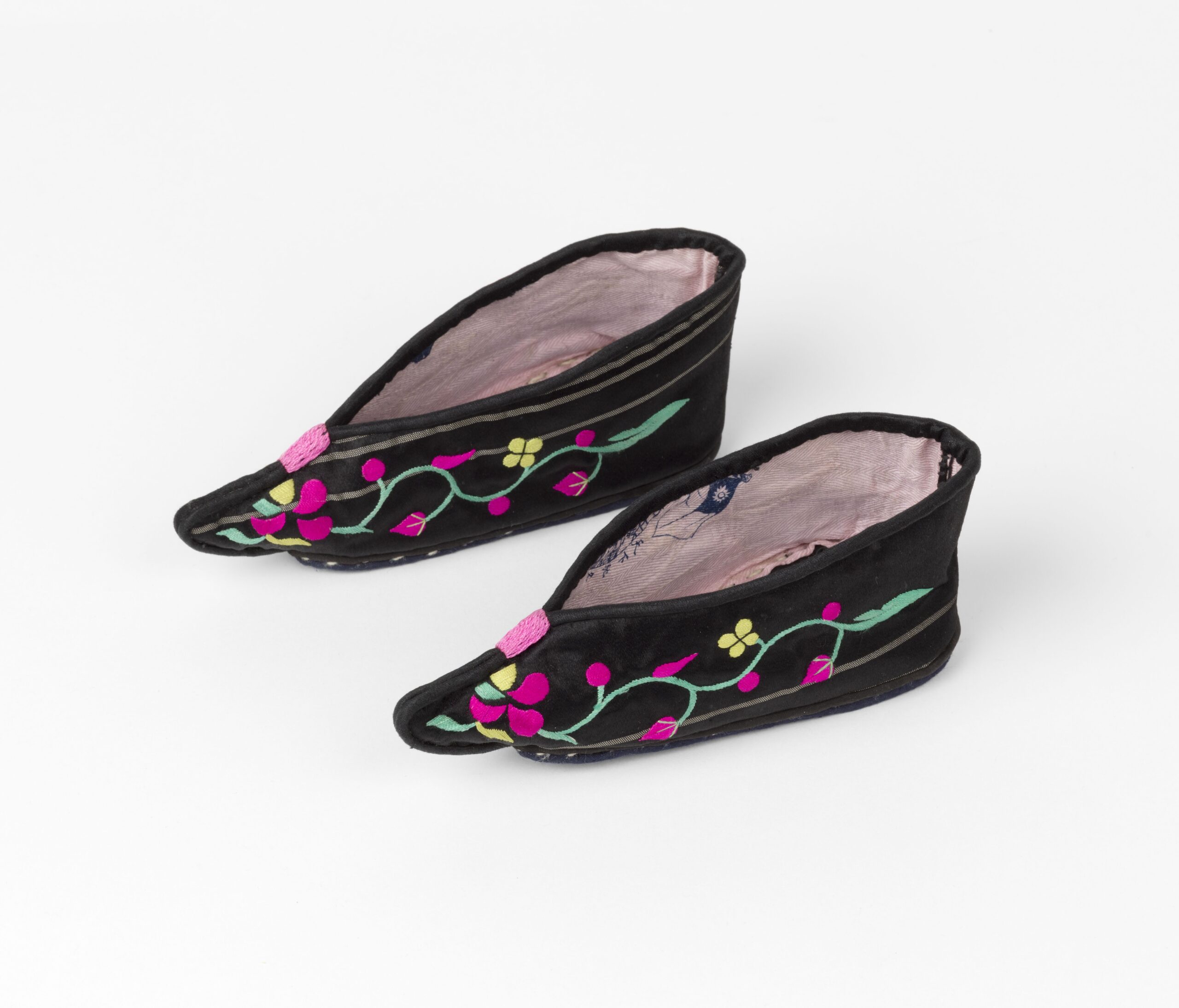 Shoes for bound feet, gong xie (弓鞋). Small pair of black silk shoes for bound feet with bright pink, yellow and green embroidery of plants. The lining of the shoes indicate they were commercially made in the early 20th century, a time when foot binding was beginning to become controversial in China.