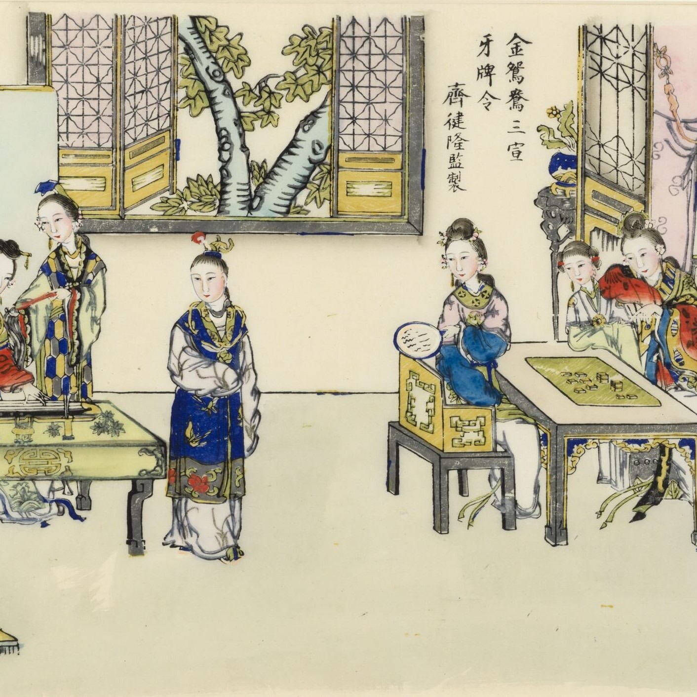 This watercolour painting on rice paper represents a court scene possibly ‘Poker Game Announced by Jin Yuanyang’ in Chapter 40 of ‘Dream of a Red Chamber’, a famous 18th-century Chinese novel authored by Cao Xueqin.