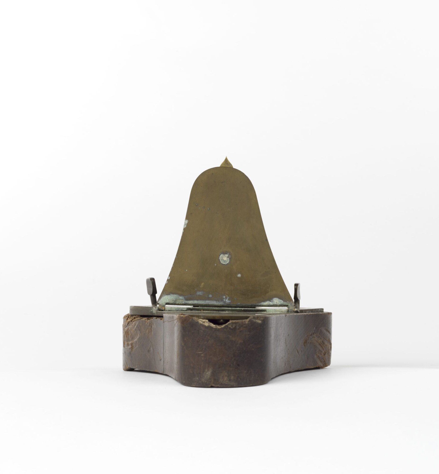 Chinese portable hybrid timekeeping device with sun dial (for reading time by the shadow cast by the sun during the day) and possible water clock (for reading the time made by water drips at night) made of wood and brass with moveable pieces including a gnomon.